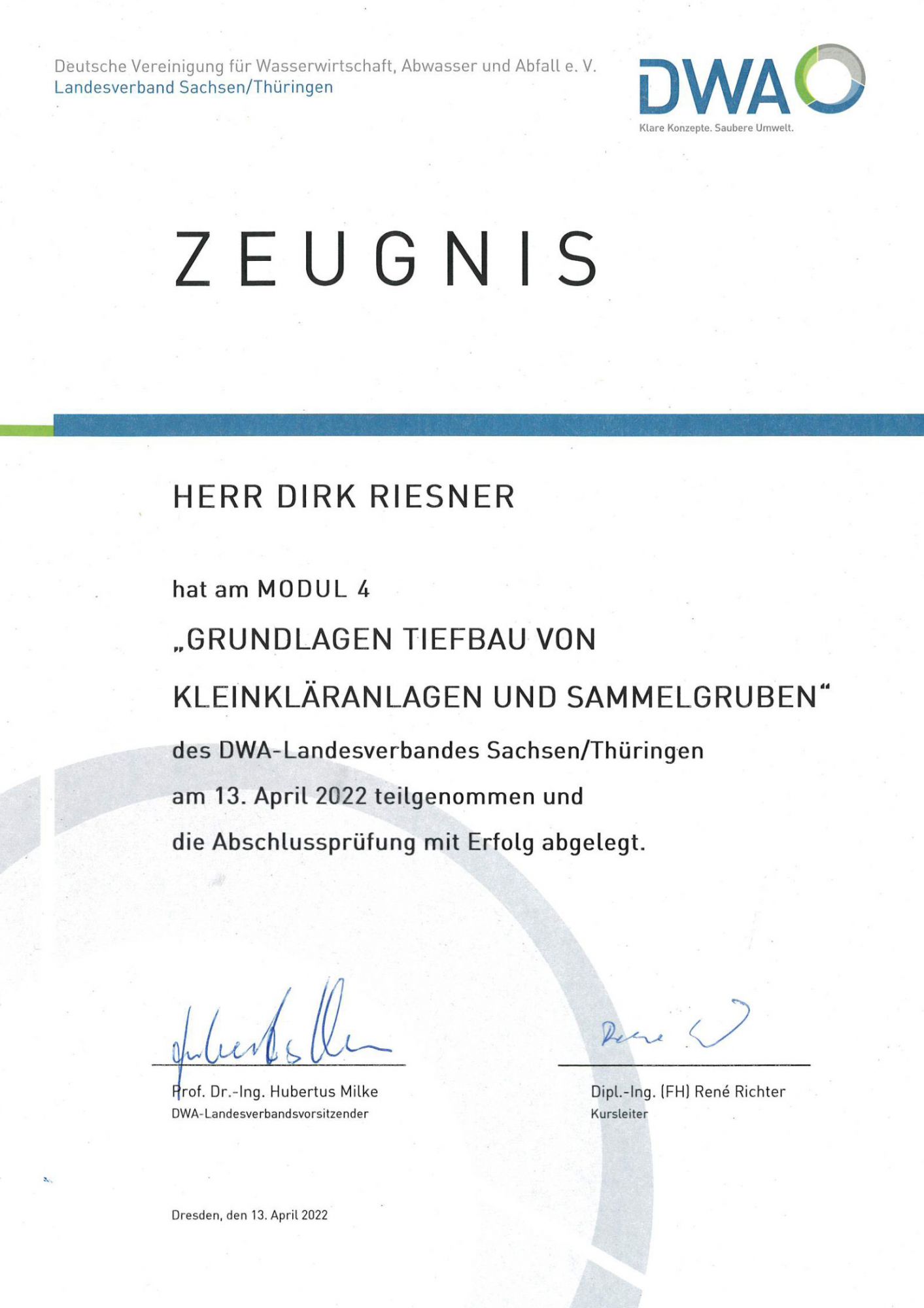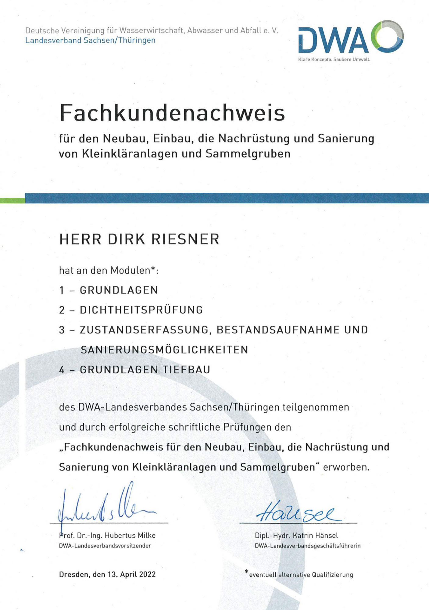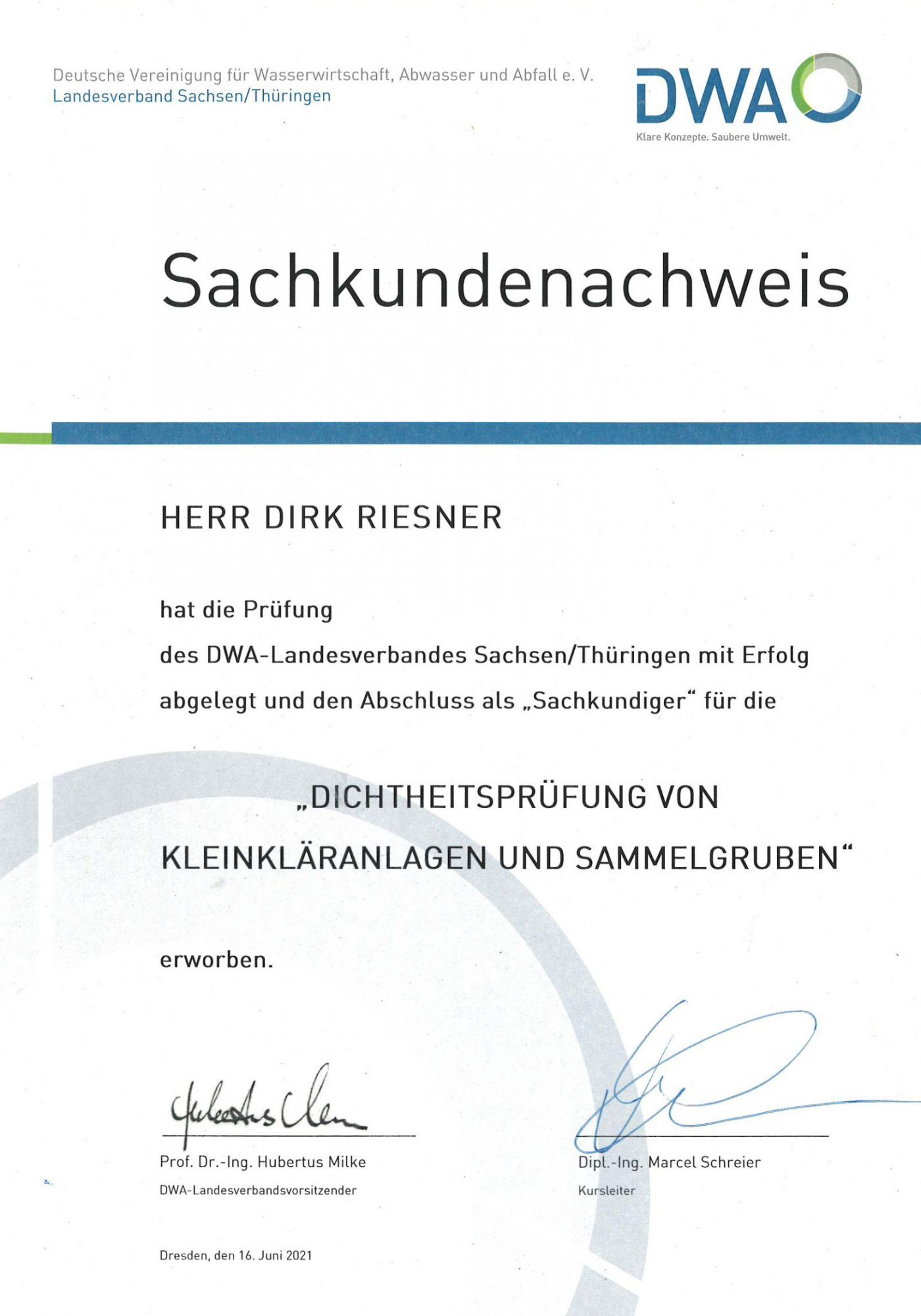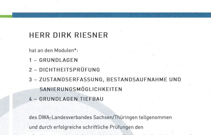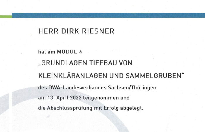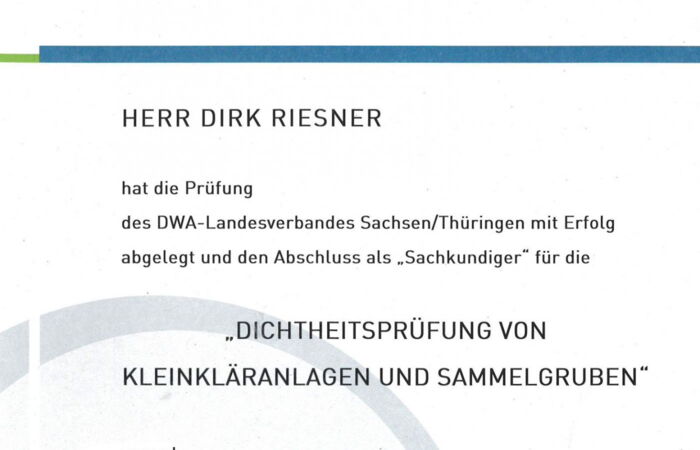 Herr Riesner hat sich im Bereich Dichtheitsprüfung und Grundlagen Tiefbau von Kleinkläranlagen und Sammelgruben weitergebildet.