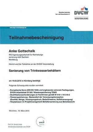 Im Rahmen einer kontinuierlichen Weiterbildung unserer Mitarbeiter im Sanierungsbereich nahm Frau Anke Gottschalk an einer DVGW-Veranstaltung zum Thema Sanierung von Trinkwasserbehältern teil, um sich zu den folgenden Schwerpunkten fortzubilden.